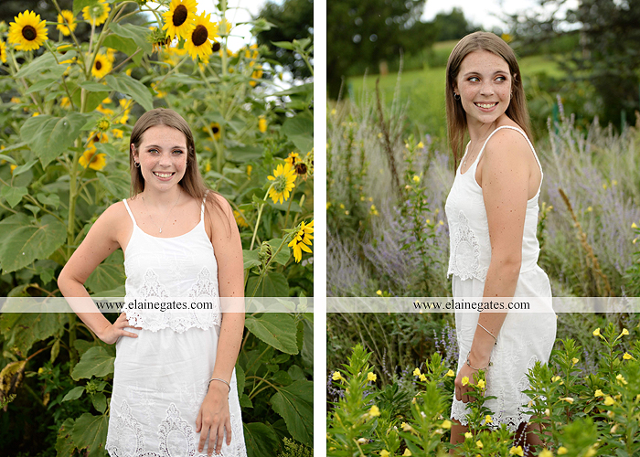28 Sep Mechanicsburg Central PA high school senior portrait photographer Class of 2019 female girl Red Land wooden swing formal iron bench wildflowers brick wall grass road fence water creek stream field field hockey sunflowers {Keirstin S.}