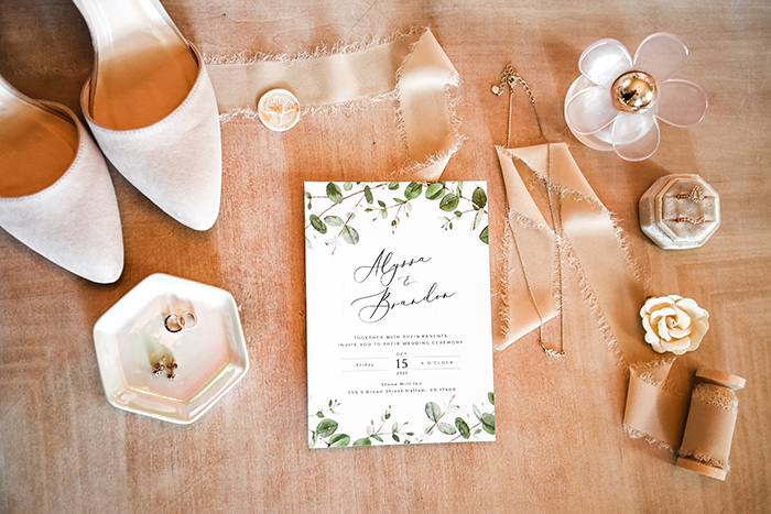 Finally, the filler details! Be sure to set aside a few flowers from your bouquet or table setting to bring a pop of greenery to the photos. You could also bring ribbon, a jewelry dish, wedding stamp, personalized hanger, or anything else that goes with your wedding aesthetic.