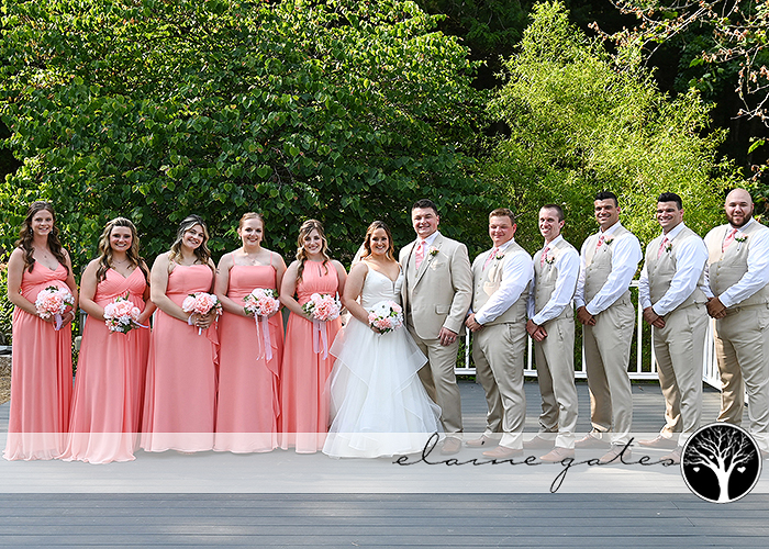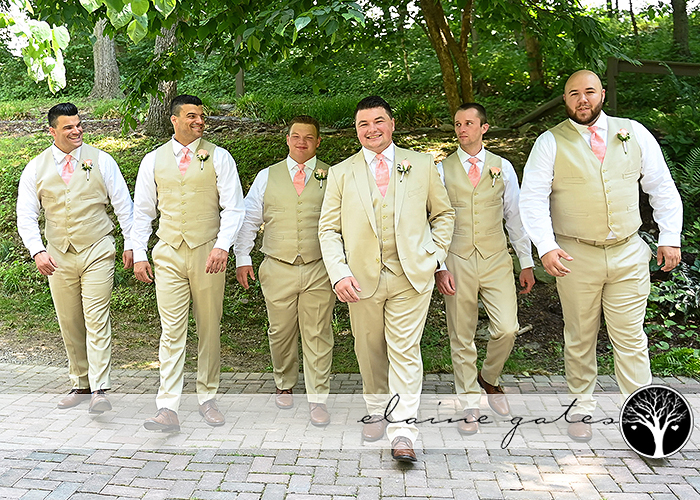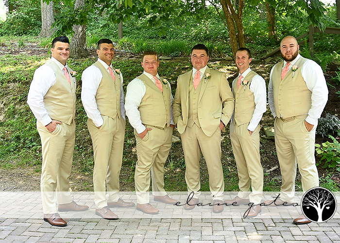 Katie’s impeccable taste shone through as she chose floor-length light peach/coral dresses for her bridesmaids, perfectly complementing the natural beauty of the surroundings. The groomsmen looked dashing in their light tan suits, adding an air of elegance to the day. And the choice of faux flowers in delicate shades of light pink was simply breathtaking.