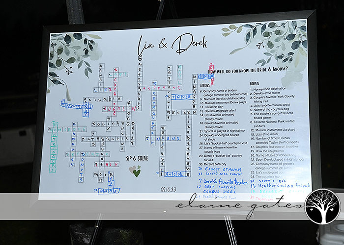 At the cocktail hour, right by the bar, they had a crossword puzzle display that was downright adorable. Guests had a blast filling it out, adding a playful twist to the festivities. Lia’s love for Taylor Swift was on full display, and from the moment I arrived till the end of the night, they serenaded us with their sing-along.