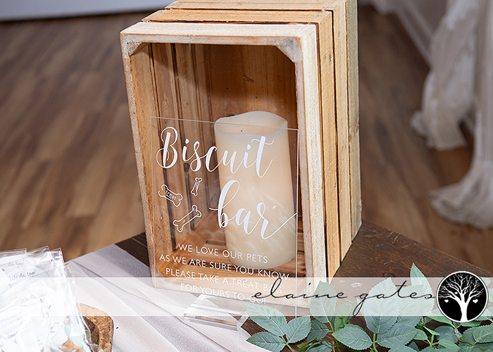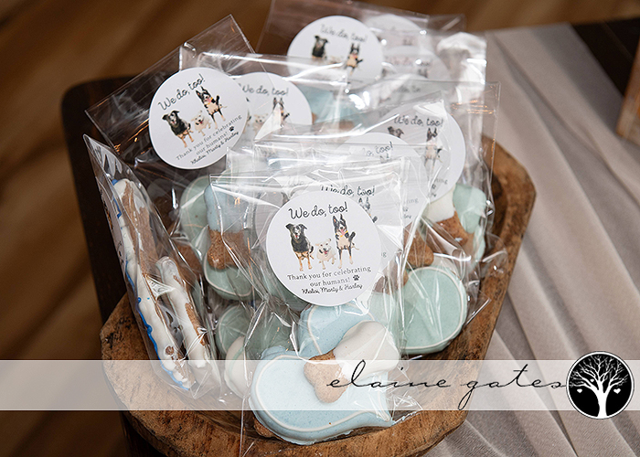 Despite the forecast calling for showers, we were blessed with perfect weather – sunny skies and comfortable temperatures. The couple’s love for their dogs was evident in the custom dog biscuit favors for their guests, adding a personal touch to the celebration.