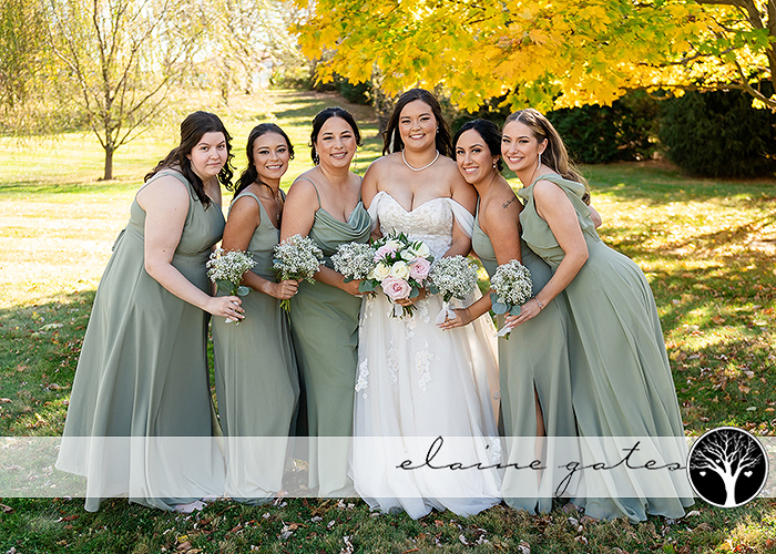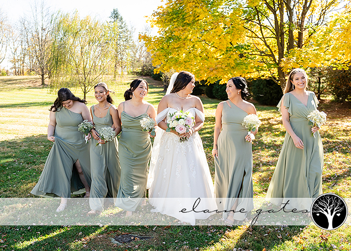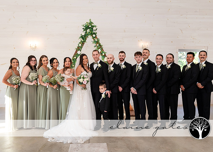 Kayla looked breathtaking in her wedding gown while her bridesmaids donned lovely sage green dresses. The groom chose a matching sage green bowtie, complemented by groomsmen who wore coordinating ties.